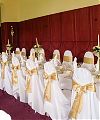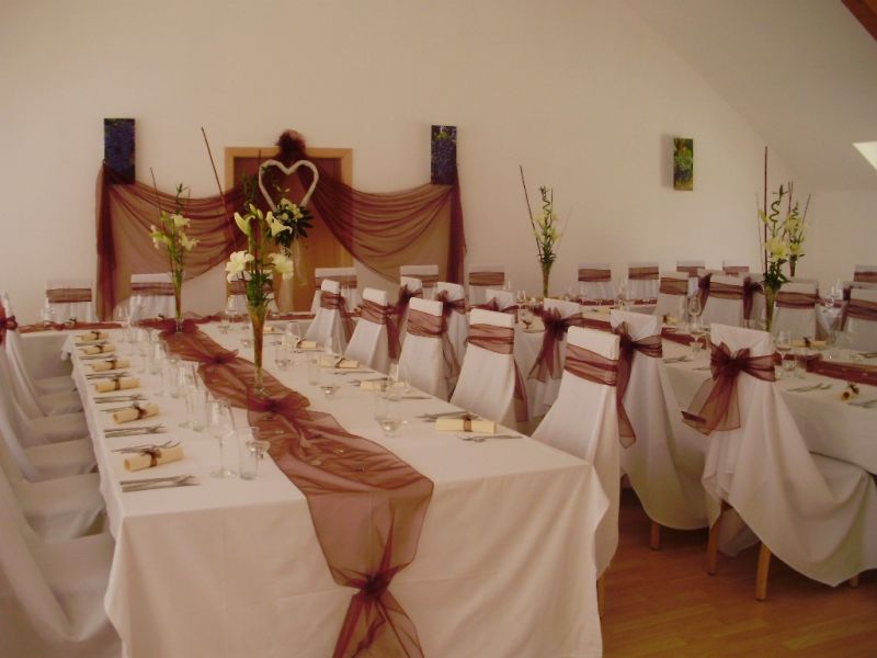 Ma már szinte minden esküvő elengedhetetlen kellékei a székszoknyák, hiszen ünnepivé, még különlegesebbé varázsolják az esküvői dekorációt, kiemelve és erősítve annak színvilágát és harmóniáját. A kezdetekben még csak néhány különböző színű szalaggal rendelkezett Irodánk, ám a nagy érdeklődésre való tekintettel, az évek során újabb és újabb színválasztékok készültek el. Így ma már 16 különböző színű szalagot tudunk ajánlani fehér (minden székre felrakható) székszoknyáinkhoz: fehér, krém, rózsaszín, barack, lila, mályva, pink, narancs, piros, bordó, kék, világoszöld, sötétzöld, gesztenyebarna, étcsokoládé-barna, arany.